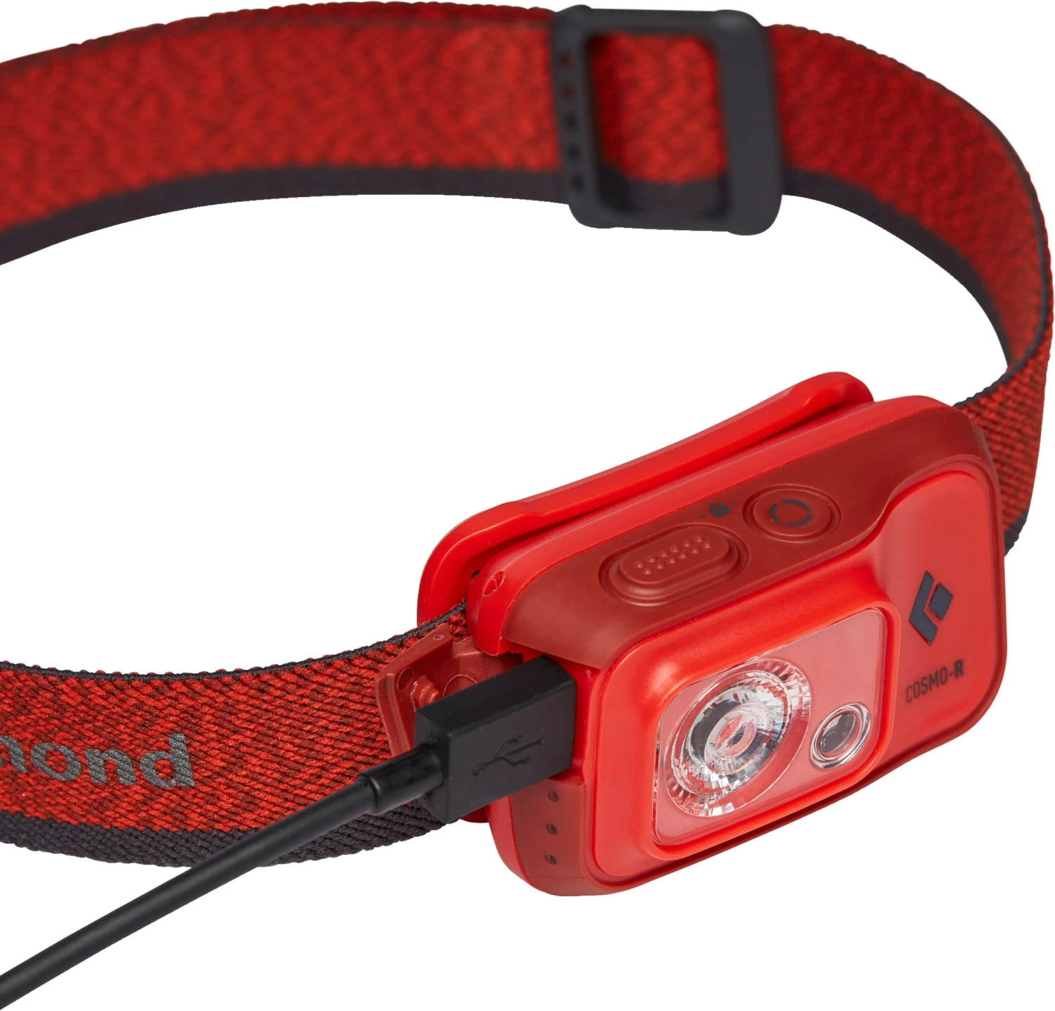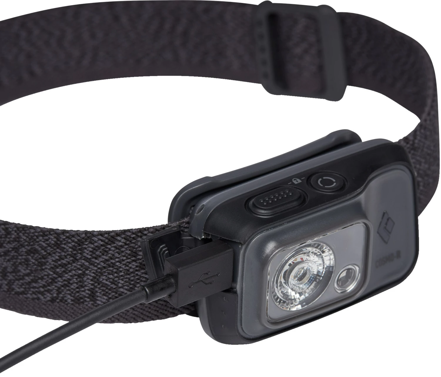 Cosmo 350-R Headlamp kan tiltes op/ned og af-/påmonteres let på det bløde, elastiske pandebånd. Energien til de nærmest udødelige L.E.D.-komponenter kommer som nævnt fra det medfølgende Li-ion batteri, og batteriets tilbageværende levetid i procent kan aflæses på det smarte batterimeter, og i disse sparetider vil du nok sætte pris på den smarte digitale låsefunktion, som gør, at lampen ikke tænder utilsigtet.