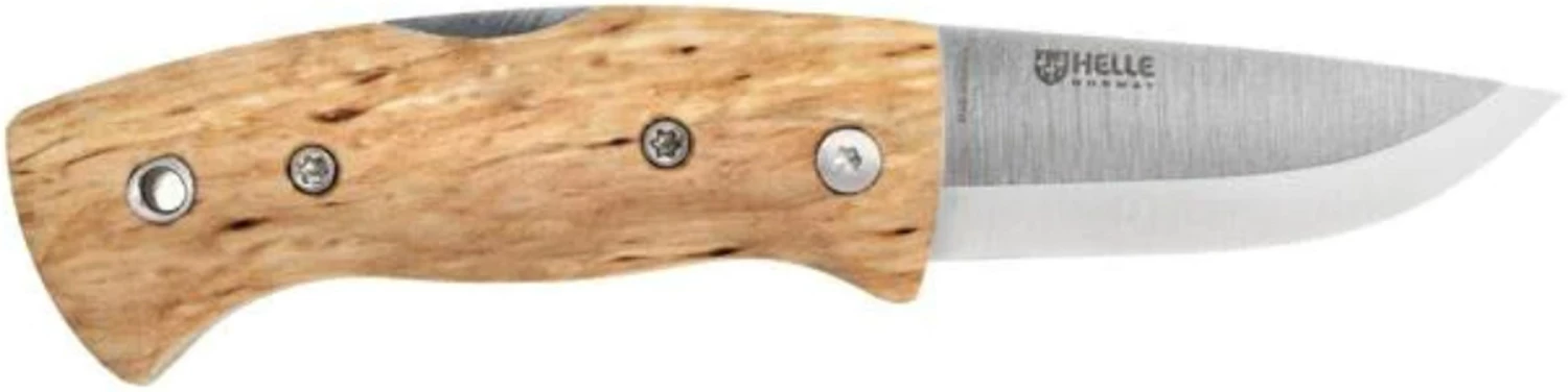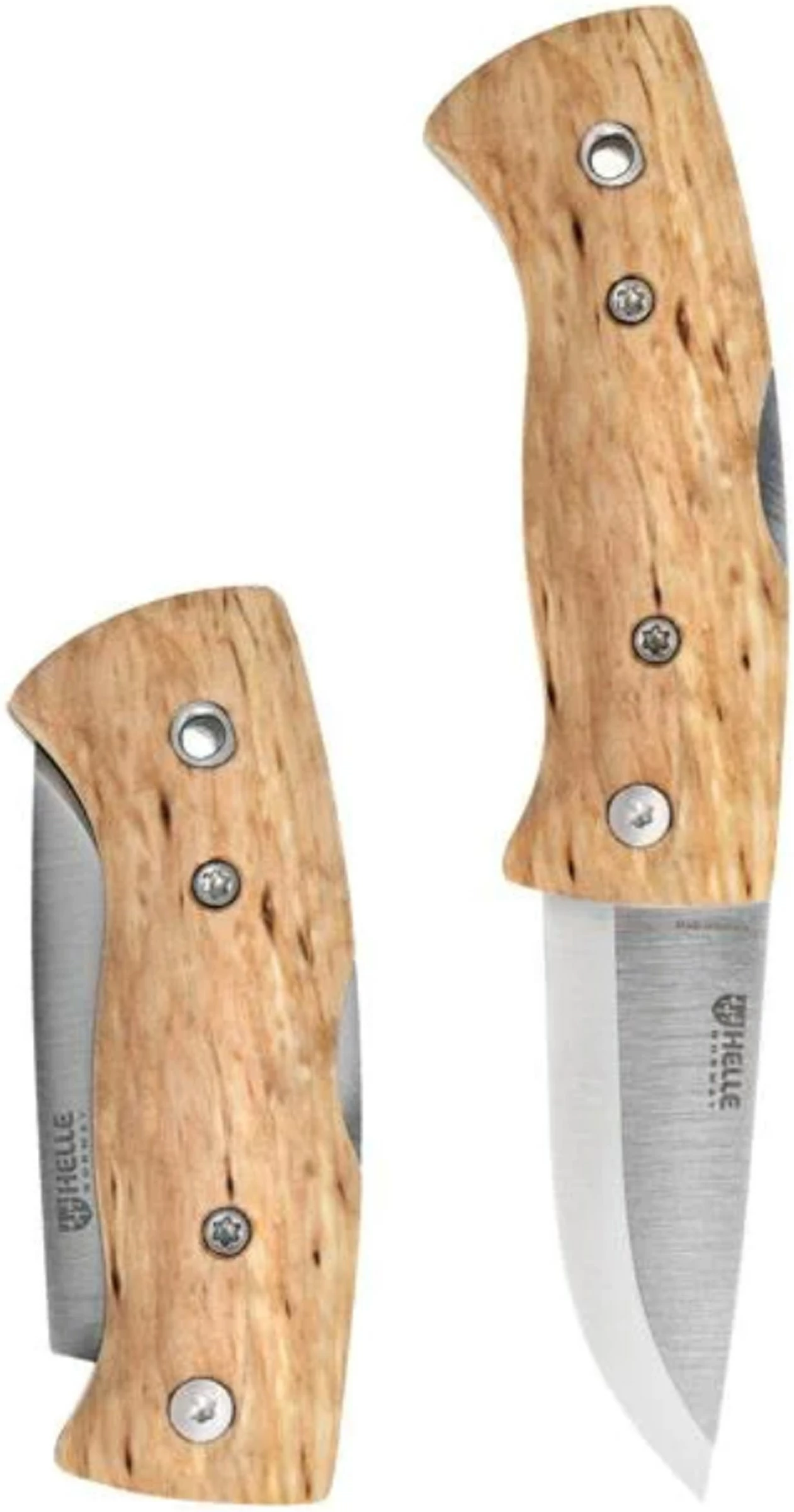 Den korte klinge er lavet af Helles tredobbelt laminerede rustfrit stål og har en klassisk skandinavisk slibekant.