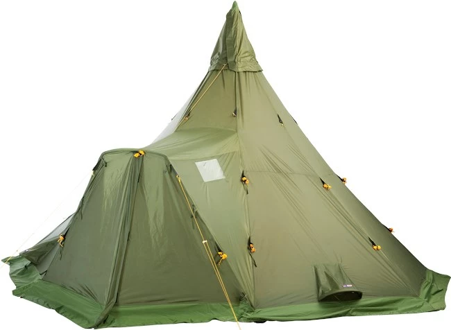 Udbygningen øger gulvarealet markant og giver en helt fantastisk rumfornemmelse indeni lavvu’en. Foruden dette forlængede indgangsparti har Varanger Camp helt samme detaljer og løsninger som Varanger-serien.