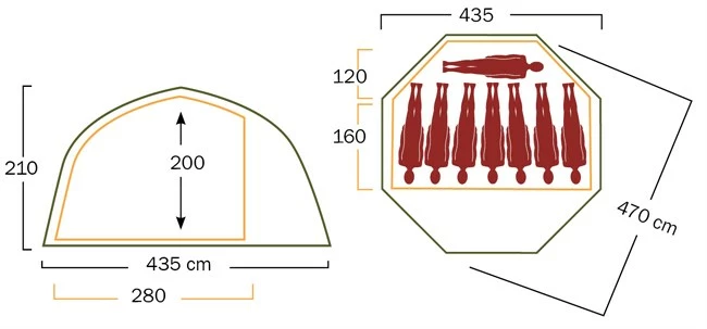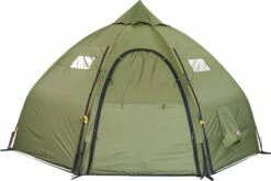 Kuppelkonstruktionen gør, at teltet får ekstra stejle vægge, hvilket afstedkommer en utrolig god plads indeni teltet og en rigtig god højde. Varanger Dome 8-10 er udstyret med tre store indgangsdøre, hvoraf de to er forsynet med vinduer, som giver godt med lys og mulighed for at følge med i vejrudviklingen. Myggenettet i indgangsdøren sørger – sammen med de justerbare ventiler og den regulerbare tophat – for at sikre et godt indeklima i teltet.