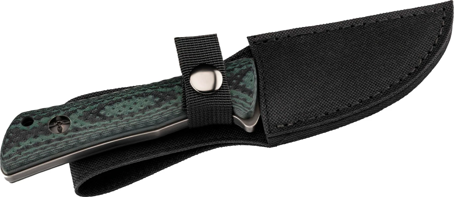 Håndtagskonstruktionen er lavet med en udpræget fingerbeskyttelse, og selve grebet er fremstillet med vejrbestandige håndtagsskaller af grøn-grå kornet G10-kunststof. Hullet bagtil giver mulighed for at fastgøre fx et stykke rebsnor.