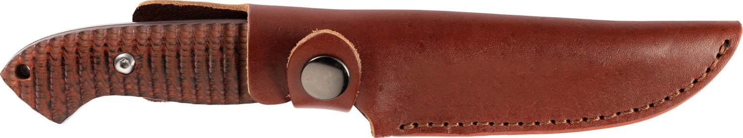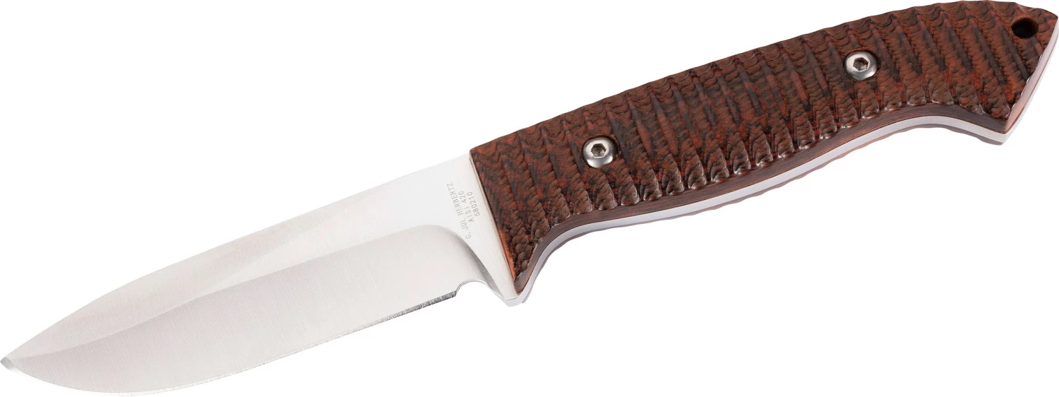 Denne stilfulde bæltekniv fra Herbertz kendetegneres ved sin karakteristiske og funktionelle drop-point fuldtangeklinge af AISI 420 i rustfrit stål og det flot forarbejdede skæfte af smukt og robust pakkatræ.