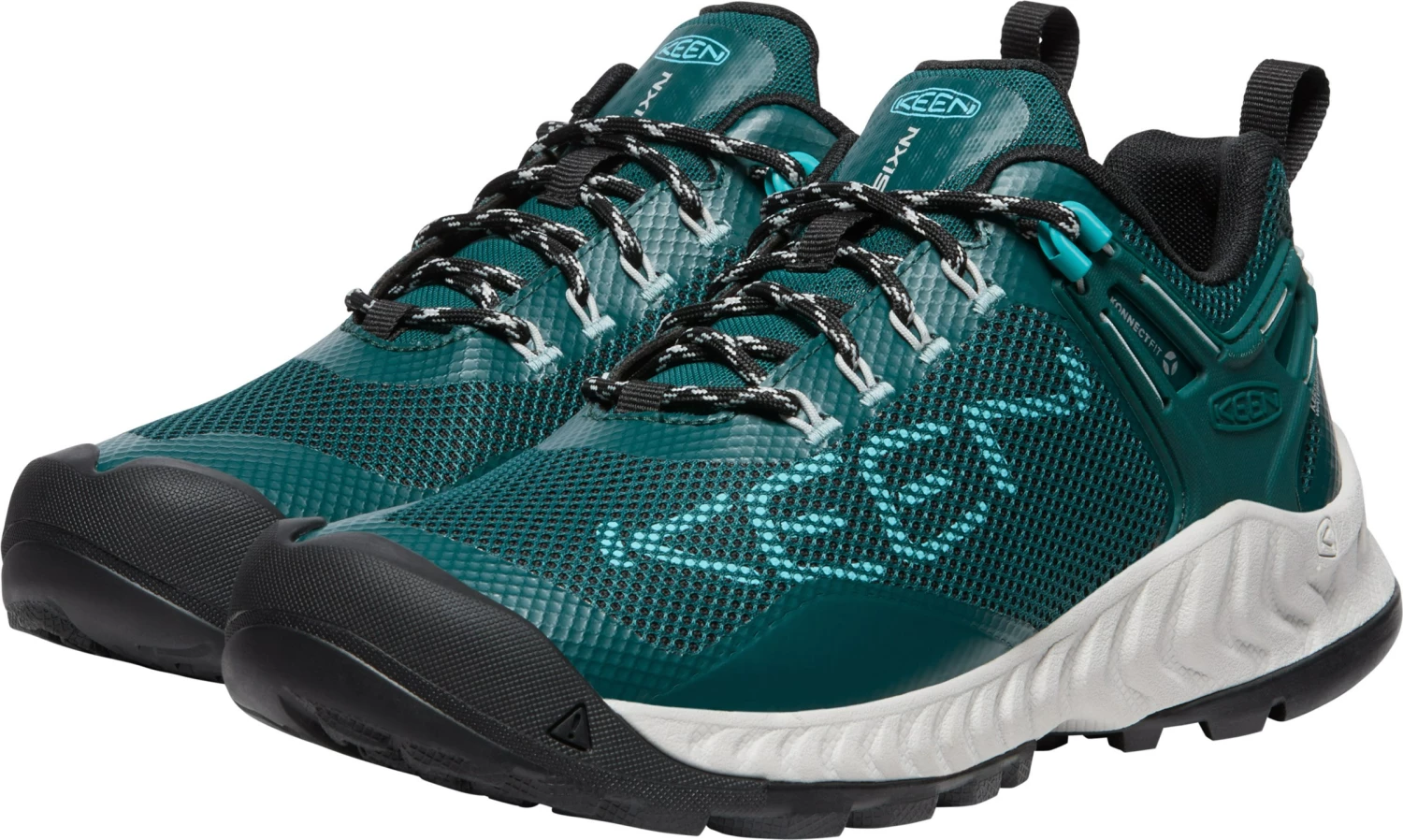 Den vandtætte og åndbare Nxis Evo WP Women er fremstillet med vedligeholdelsesfri overdel af ventilerende mesh og forstærkende kunststof, og herunder er den gennemprøvede KEEN.DRY® -membran placeret for at sikre, at fødderne holdes tørre i al slags vejr. Indvendigt er skoen foret med varmeregulerende og svedtransporterende DryMesh™, der sikrer det rette klima omkring foden, og denne foring er naturligvis antibakterielt behandlet med miljøvenlig Eco Anti-Odor™.