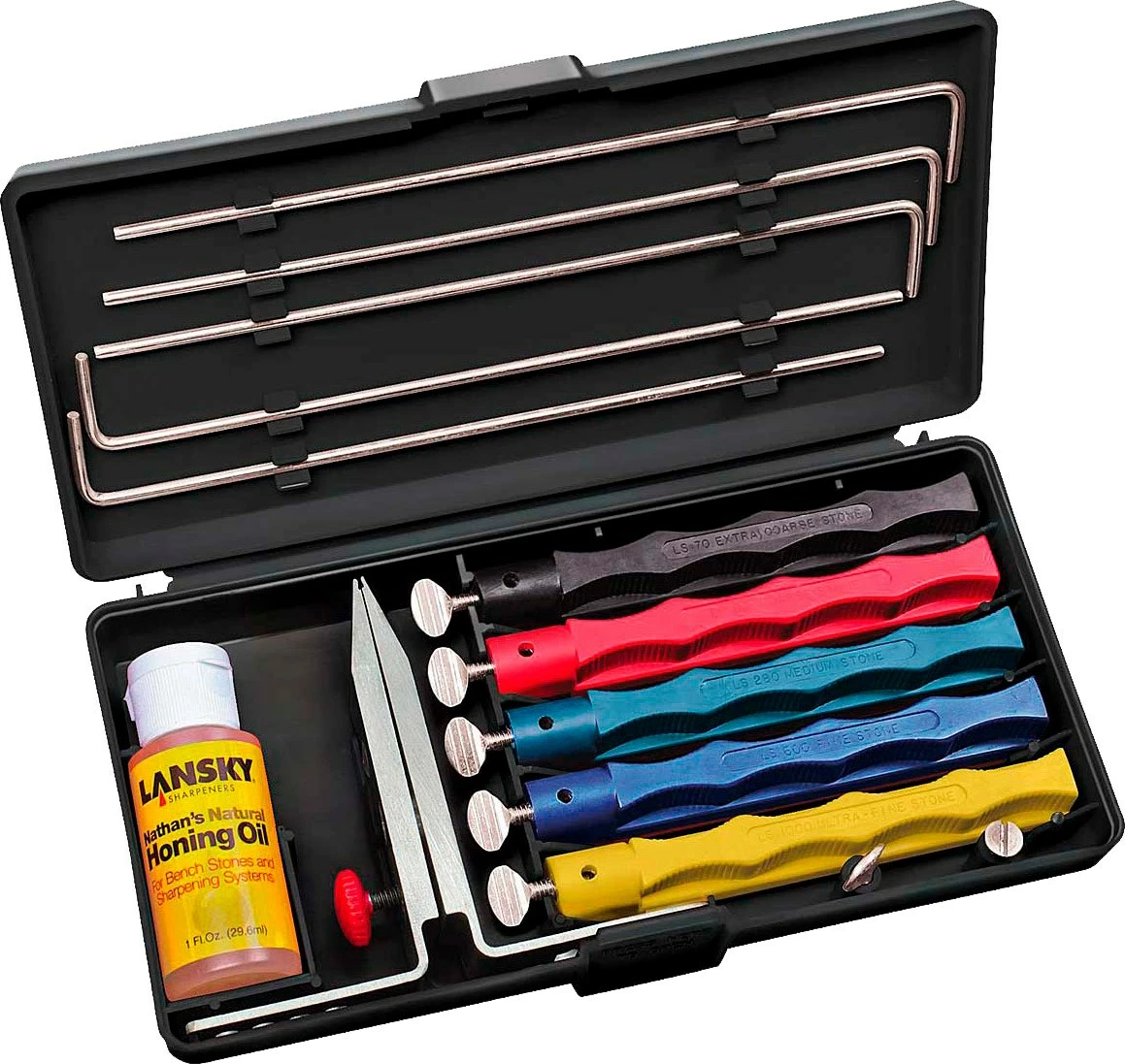 Lansky Deluxe Controlled-Angle Sharpening System består af fem forskellige slibesten, nemlig en meget grov (korn 70), en grov (korn 120), en medium (korn 280), en fin (korn 600) og en ekstra fin (korn 1.000), ligesom den medfølgende slibeolie vil sikre det bedste resultat.