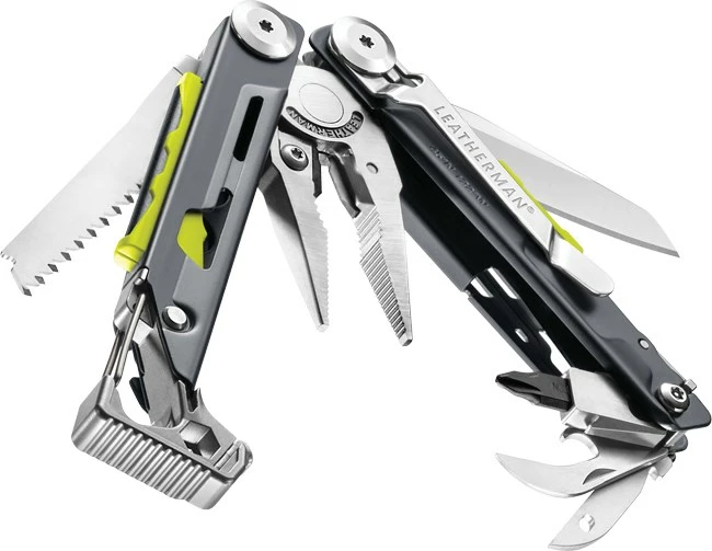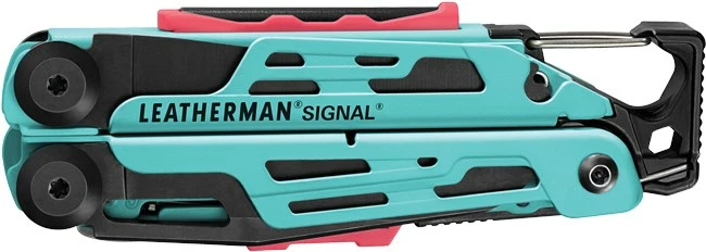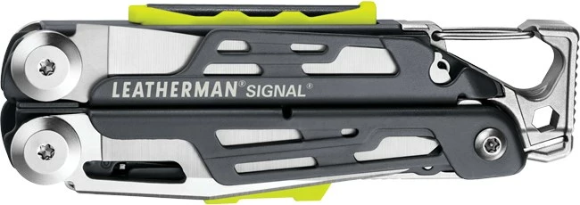 Designed for the outdoors, this multi-tool packs a firestarter, hammer, one-handed blade and an emergency whistle. A perfect fit for any adventure, the Signal combines 19 useful tools into a compact, 4.5 inch size. This multi-tool readies you for the unexpected with its fire-starting ferro rod, 420HC combo blade, and emergency whistle. Tighten gear with the customizable bit driver and anchor your tent stakes with the built-in hammer. Gear up and go further with the Leatherman Signal. DLC coating on stainless steel and black. Cerakote™ for coyote tan, aqua, crimson, grey, and cobalt colors.