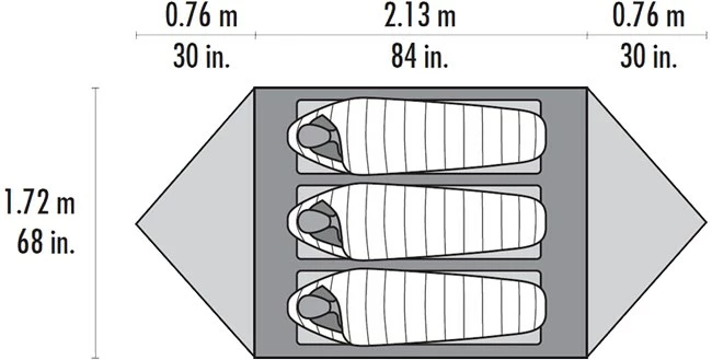 Trods den lave vægt er der ganske god plads til tre personer i Mutha Hubba™ NX Tent. Inderteltet byder nemlig på en liggelængde på 213 cm, en bredde på 172 cm og en reel siddehøjde i inderteltet på op mod 112 cm, hvilket levner udmærket plads til tre personer. Og i modsætning til mange konkurrerende modeller, rejses Mutha Hubba™ NX Tent med en særlig stangkonstruktion med to parallelle buer og en tværgående, der gør det meget vindstabilt. Da teltet er helt symmetrisk omkring en midterakse i teltets længderetning, er Mutha Hubba™ NX Tent udstyret med en meget rummelig apsis foran hver sideindgang i hele teltets længde, som er op til hele 76 cm. dyb, så der er plads til både de overnattendes rygsække, fodtøj og en gang madlavning i dårligt vejr.
