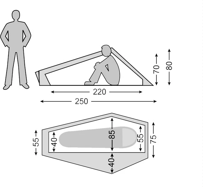 Et udsøgt materialevalg og en række geniale designløsninger har således gjort det muligt at nå dette næsten umulige mål, som samtidig sætter helt nye standarder for markedets letteste telte. Inderteltet er 220 cm. langt og op til 85 cm. bredt og højden er 70 cm, så der er rent faktisk forbavsende meget plads i inderteltet, når man tager den ekstremt lave vægt i betragtning. Apsis er op til 40 cm. bred og 250 cm. lang, så der er plads til både støvler (som alternativt kan placeres i det lille apsisområde i teltets fodende), rygsæk og brug af kogegrej, så der inde fra teltet kan laves mad eller koges kaffe i møgvejr. Her anbefales det, at man benytter den medfølgende tarpstang og løfter døren op, hvilket øger det overdækkede areal betragteligt.