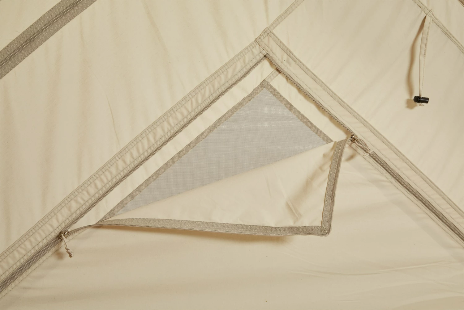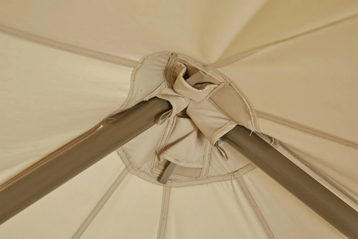 Og dette areal kan udvides ved at koble det sammen med ét eller flere af den mindre Vimur 4.8 Basic Cotton eller Vimur 5.6 Basic Cotton, så man eventuelt kan få opdelt sovekabiner og det store fællesareal. Og rumfornemmelsen er slående i dette telt, for dels har det en indvendig højde op til hele 3 meter, men de stejle vægge og det unikke design, hvor der ikke bruges én eller flere separate midterstænger, men i stedet en Turtle Hub™ -konstruktion med A-stænger ved blot de fire indgange, er i sandhed noget, der øger pladsfornemmelsen indeni teltet! Og så er det trods teltets størrelse samtidig utrolig nemt og hurtigt at slå op og kræver blot 16 pløkker for at stå klippefast.