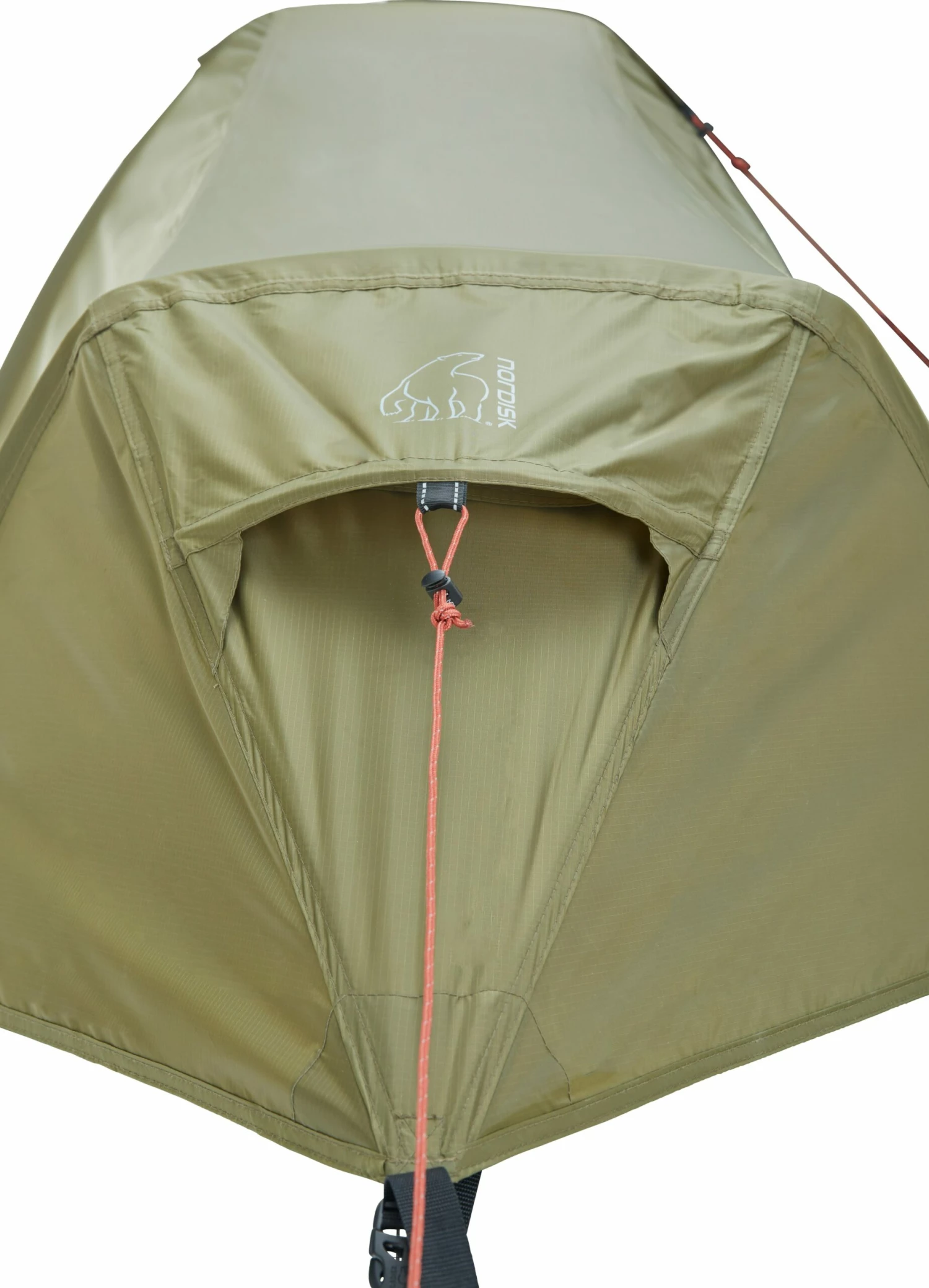 Nordisk Svalbard 1 SI har skrå indgang i siden af apsis og døren kan også her rulles sammen og gemmes væk i en fiks mesh-lomme. Lynlåsen til indgangen i oversejlet ligger beskyttet bag en stormflap, som fikseres magnetisk. En både let og meget velfungerende løsning. Oversejlet i silikonebelagt 40 Denier ripstop-nylon er ekstremt let og bomstærkt – også stærkere, end de fleste andre silikonecoatede oversejl! Denne type oversejl er mere UV/UVA-resistent end den klassiske PU-belagte nylon – det kan altså tåle eksponering af solens stråler i længere tid end et PU-belagt nylonoversejl. Oversejlet er belagt med silikone to gange udvendigt og én gang indvendigt.