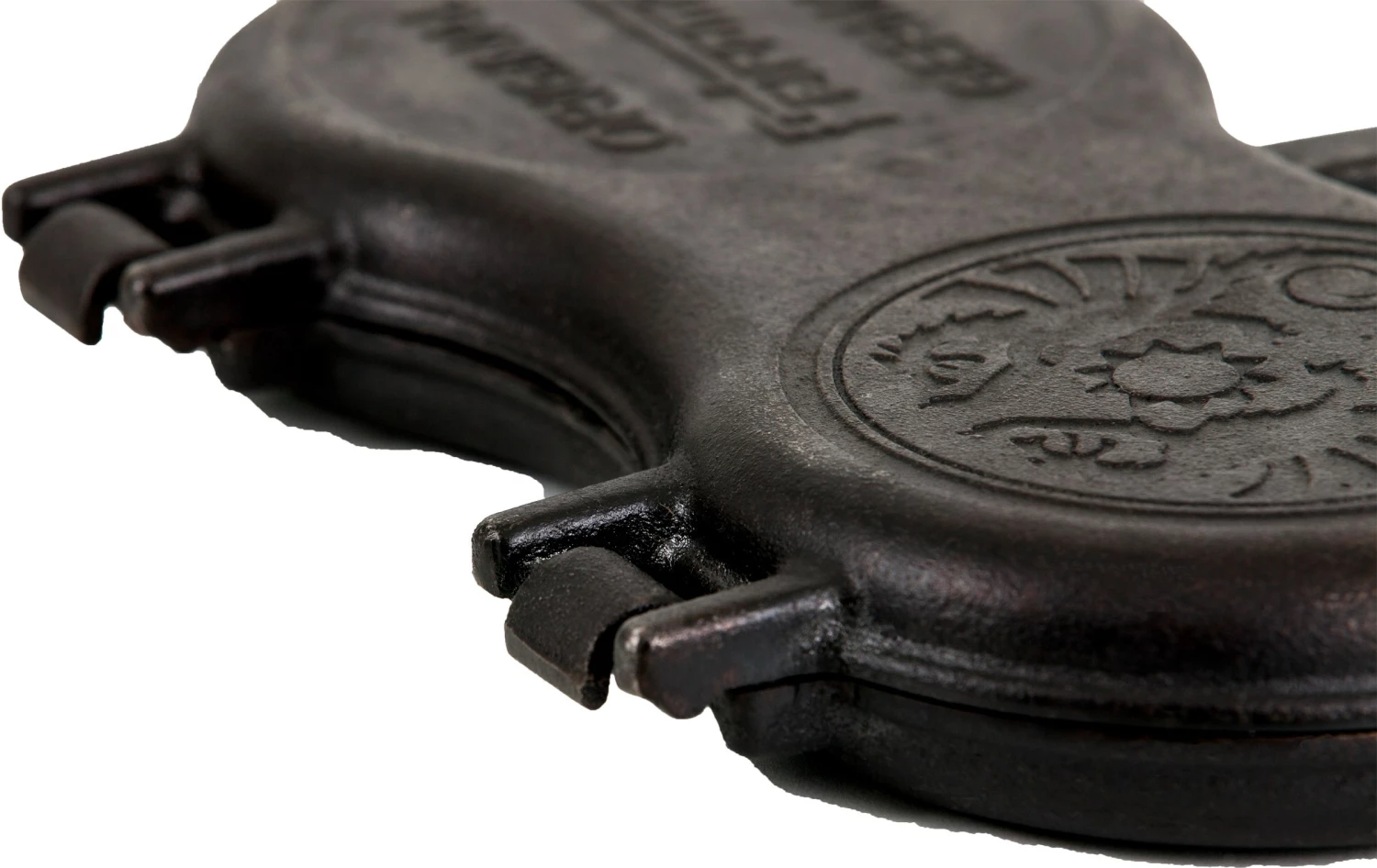 Burger Iron lukkes sammen ved hjælp af en lås i selve skaftet, så man ikke pludselig taber indholdet ned i bålet eller gløderne. Og så er den nem at rengøre, grundet støbejernets naturlige non-stick effekt.