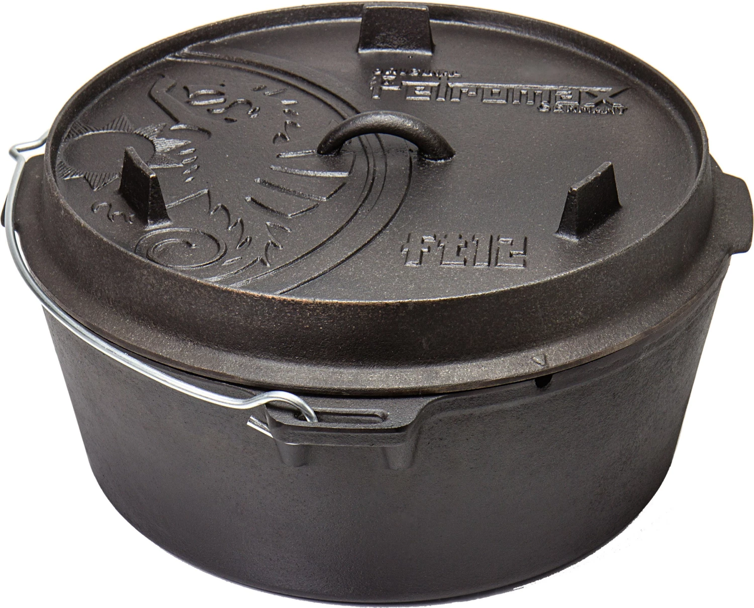 Takket være de fantastiske kendetegn ved støbejern og overfladens særlige struktur, opbevares varmen effektivt og fordeles ensartet. Den forbehandlede overflade gør præparering unødvendig, og den robuste ‘dutch oven’ kan bruges med det samme. Udendørs bruges den i eller over åben ild eller med kul og briketter. Alle modeller fra Petromax er udstyret med både hank og kraftigt låg med forhøjet kant, som holder gløderne på plads, hvis låget dækkes med gløder. Din ‘dutch oven’ opvarmes således fra alle sider og er dermed egnet til fx bagning af brød.