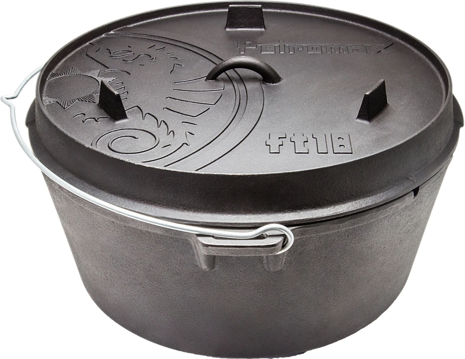 Takket være de fantastiske kendetegn ved støbejern og overfladens særlige struktur, opbevares varmen effektivt og fordeles ensartet. Den forbehandlede overflade gør præparering unødvendig, og den robuste ‘dutch oven’ kan bruges med det samme. Udendørs bruges den i eller over åben ild eller med kul og briketter. Alle modeller fra Petromax er udstyret med både hank og kraftigt låg med forhøjet kant, som holder gløderne på plads, hvis låget dækkes med gløder. Din ‘dutch oven’ opvarmes således fra alle sider og er dermed egnet til fx bagning af brød.