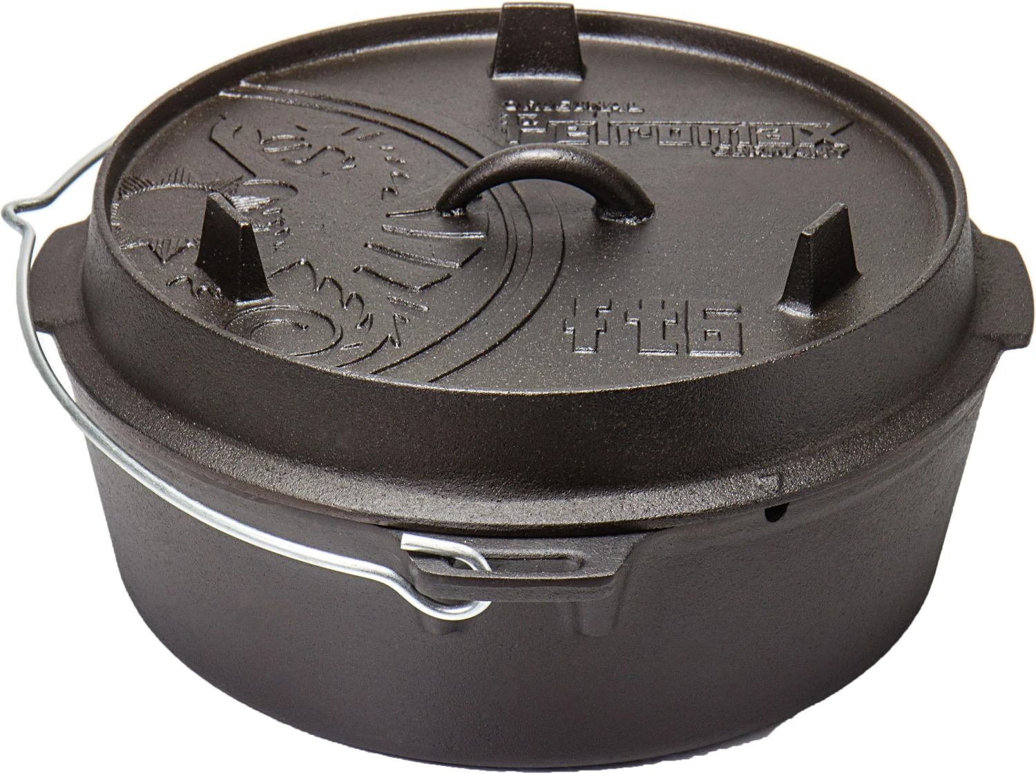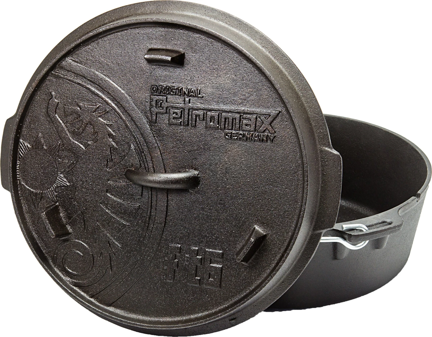 Takket være de fantastiske kendetegn ved støbejern og overfladens særlige struktur, opbevares varmen effektivt og fordeles ensartet. Den forbehandlede overflade gør præparering unødvendig, og den robuste ‘dutch oven’ kan bruges med det samme. Udendørs bruges den i eller over åben ild eller med kul og briketter. Alle modeller fra Petromax er udstyret med både hank og kraftigt låg med forhøjet kant, som holder gløderne på plads, hvis låget dækkes med gløder. Din ‘dutch oven’ opvarmes således fra alle sider og er dermed egnet til fx bagning af brød.