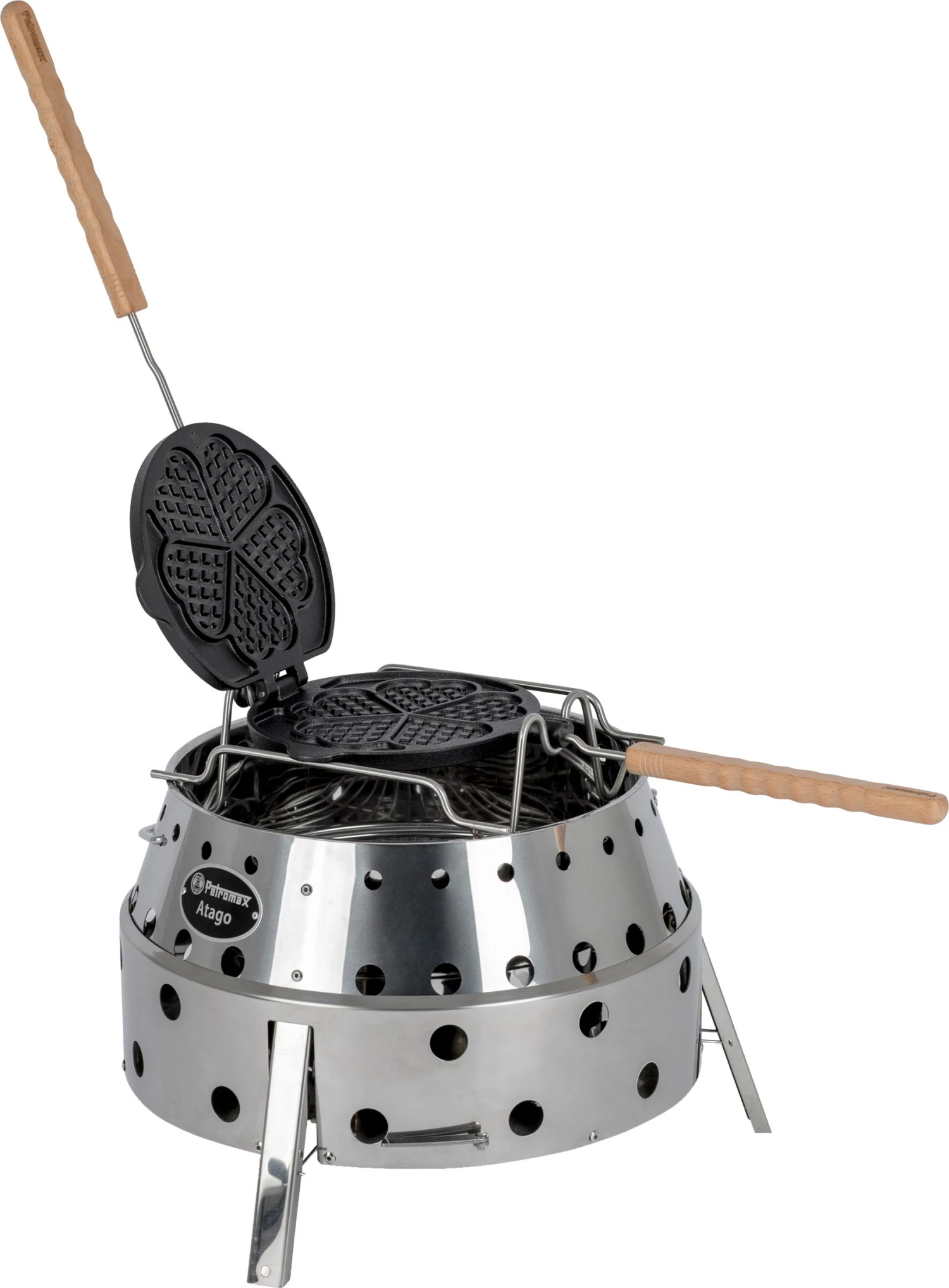 Et ideelt udendørs madlavningssted til Rotating Waffle Iron er i øvrigt Petromax’ egen Atago, for støtterammen til det roterende vaffeljern passer helt perfekt til den øverste kant på Atago, og samtidig er afstanden mellem støtteramme og kulristen tilstrækkelig til at bage vafler med indirekte varme, så du dermed opnår det bedste resultat.