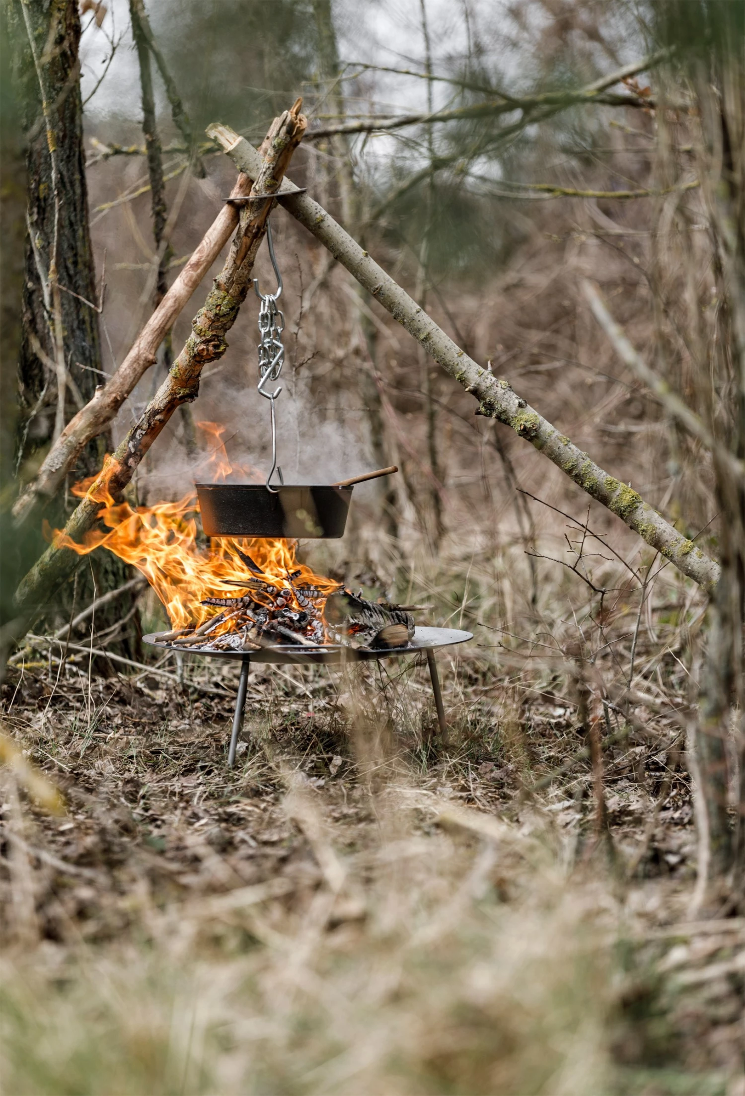 Takket være de to kroge med kæde kan din ‘dutch oven’ eller kaffekedel nemt og hurtigt hænges over den knitrende ild, og du styrer den nødvendige varme ved blot at justere kædens længde.
