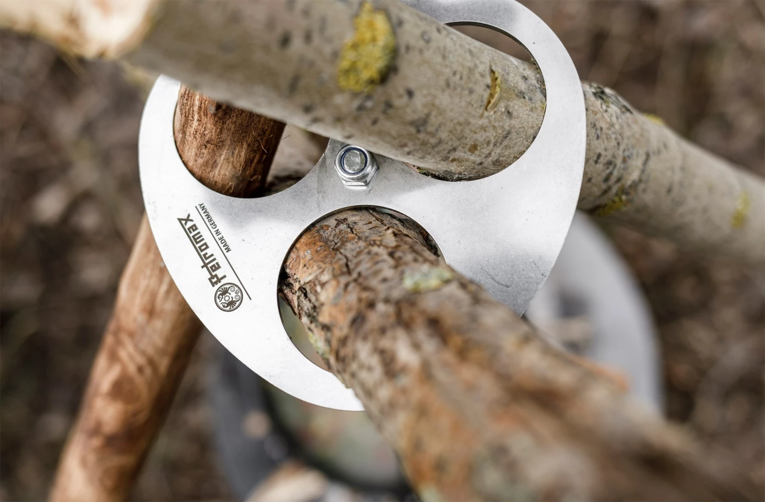 Du fører de tre tilpassede grene eller kæppe gennem åbningerne og fikserer dem ved at dreje skiven en smule. Og således er dit udendørs madlavningssted klar til brug, og din bushcraft-lejr eller bivuakplads er klar til natten.