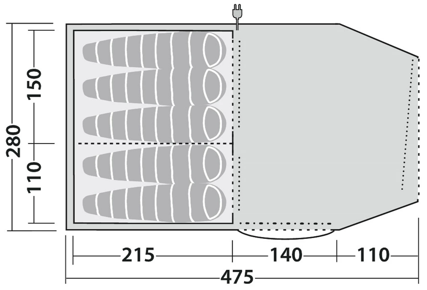 Og hermed indfrier dette store Double Dreamer 5 Tent fra Robens samtlige forventninger, vi måtte have til et både brugervenligt, solidt og funktionelt familietelt. Detaljerigdommen er slående! Robens Double Dreamer 5 Tent er et rigtig lækkert tunneltelt, hvor der gennem konstruktionen med de ekstra stejle vægge især er lagt vægt på et ekstra stort opholdsrum til spisning, leg og forskellige aktiviteter. I den store sovekabine, som kan opdeles i to ved hjælp af et lynlåslukket panel, er der plads til op til fem overnattende (eller to voksne og fire børn), da det totale grundareal er 260 cm. bredt og 215 cm. langt. Da inderteltet er sektionsopdelt i to, hvor den ene kabine er 110 cm. bred og den anden 150 cm, kan den ene halvdel lynhurtigt klipses af og rulles ind mod midten og fikseres, hvis der kun er brug for ét af inderteltene, hvormed selve apsisarealet øges betragteligt. En rigtig fin detalje!