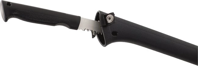 Gemt i skæftet under knaplukningen ligger en velfungerende sav med en klinge på 18 cm, som snildt skærer sig gennem også større grene. Det ergonomiske håndtag med den strukturerede overflade på saven får den til at ligge rigtig godt i hånden, også når det er koldt og fugtigt.