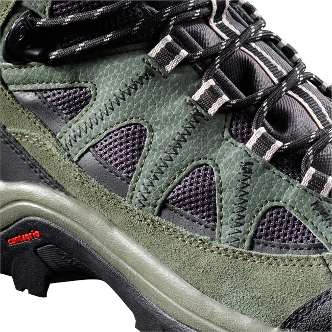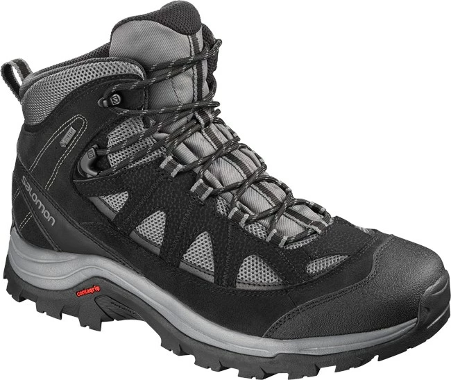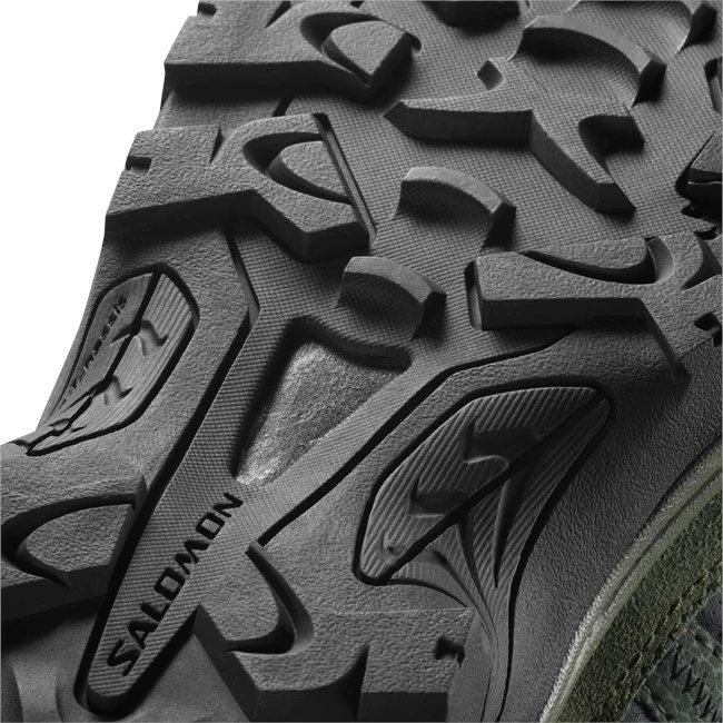 Denne gode komfort skyldes dels den velskårede overdel, hvor støvleskaftet og forfoden på nøje udregnede områder er gjort ekstra smidige, så man opnår et mere kraftfuldt afsæt, og dels opbygningen af sålen, som tager udgangspunkt i den klassiske Contagrip® -ydersål, der er en helt speciel type ydersål, udviklet af Salomon selv. Denne såltype har på nøje udregnede punkter nogle specielt udformede og selvrensende profiler både forrest og på det bageste stykke af sålen. Dette giver støvlen et ekstremt godt greb ved både op- og nedstigninger og ved pludselige opbremsninger, samtidig med, at sålen nedsætter stødbelastningen med omkring 20% sammenlignet med traditionelle såler. Så der bliver forsket og arbejdet meget i sålernes udformning og materialevalg, for dine støvler skulle jo gerne kunne stå fast i både vådt græs, på glatte sten, på is, i mudder og på stejle grusstier. En sål er bestemt ikke bare en sål!