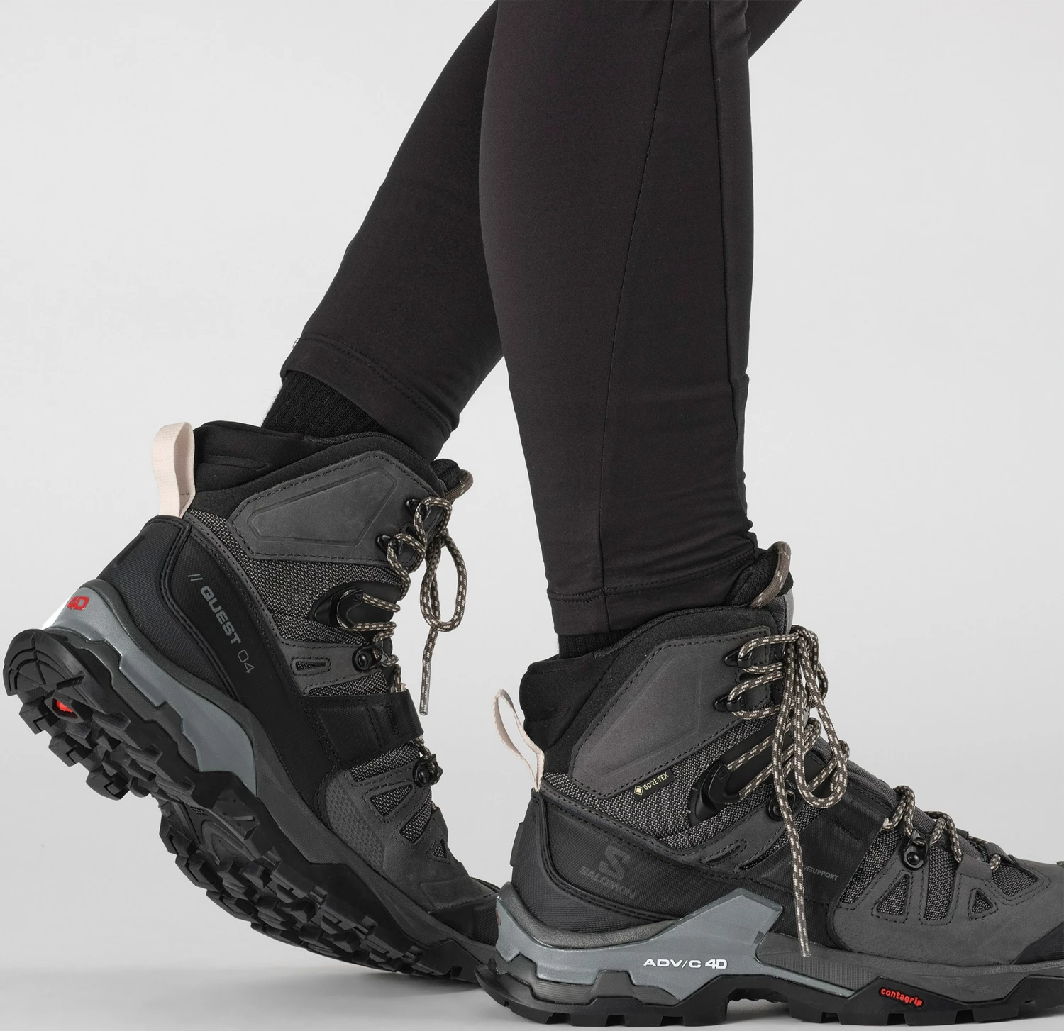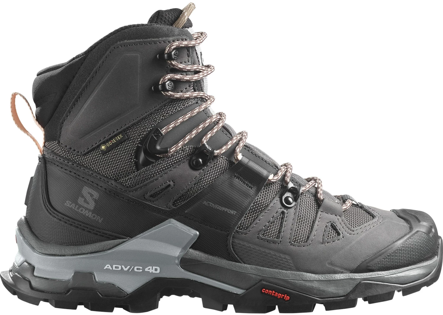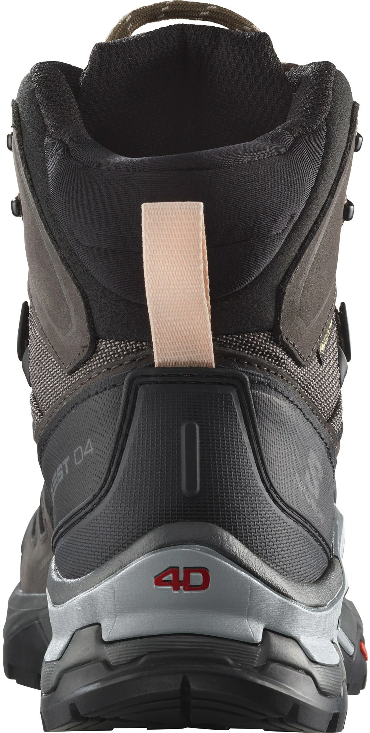 Salomon Quest 4 GTX® Women er bygget op omkring Salomons eget ADV-C 4D Chassis™, der giver stabilitet og beskyttelse, når støvlen bruges på kuperede underlag af forskellig beskaffenhed fx ved fjeldvandring udenfor stierne. Dette opnås ved at lægge et specielt udformet chassis af hårdt nylon ind mellem to lag formstøbt og stødabsorberende EnergyCell™ EVA. Dette chassis sørger for god torsionsstivhed og – på grund af det moderate fleks – en unik evne til at opretholde sålens kontakt med underlaget, også i kuperet terræn. Den udvendige afstivning af hælkappen sikrer en god, sideværts stabilitet og støtte omkring hælen.