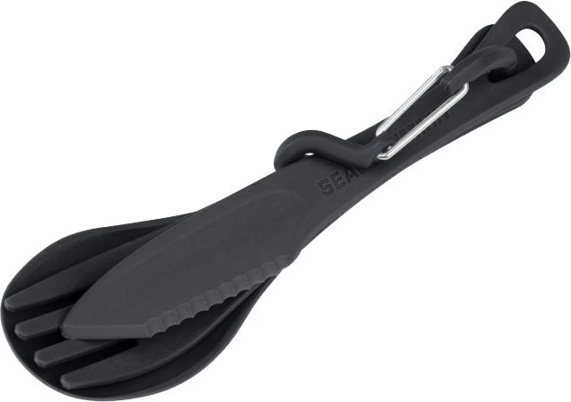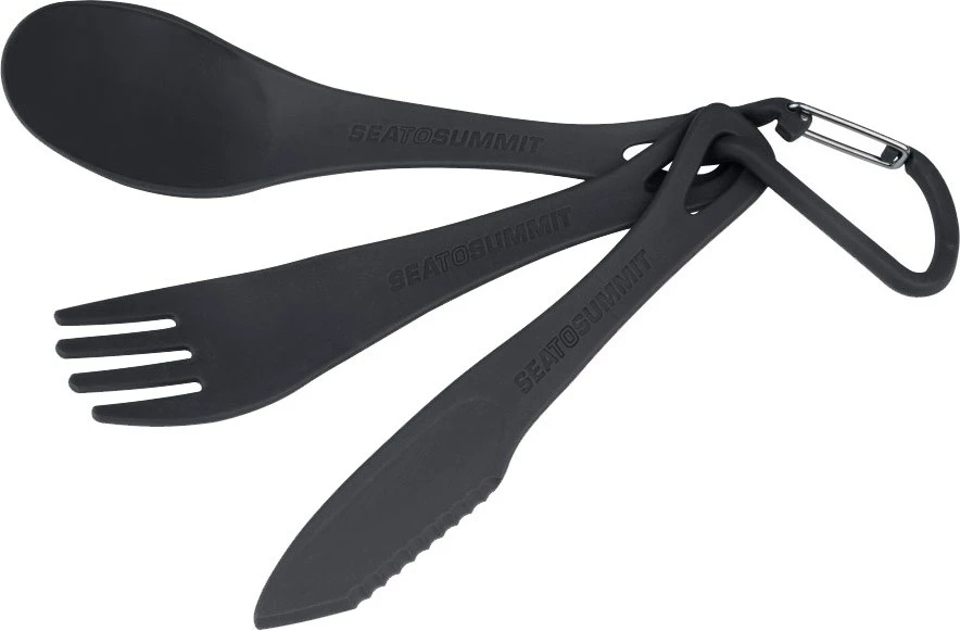 Det lille øje i enden gør det muligt at samle de tre bestikdele med den medfølgende udstyrskarabin, så man altid har delene samlet.