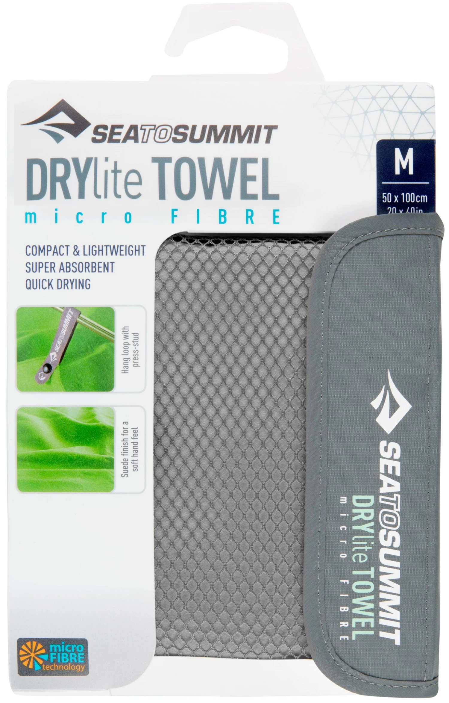 Sea to Summit DryLite Towel™ M – 50 x 100 cm er nemlig fremstillet af en superlet, ekstrem blød, slidstærk og bæredygtig mikrofiber, som vævet med den særlige overfladestruktur giver øget overfladeareal og derfor en enestående vandabsorption og ekstremt hurtigttørrende egenskaber. Håndklædet er forsynet med ophængningsstrop med knaplukning, så du altid kan hænge håndklædet fra dig.