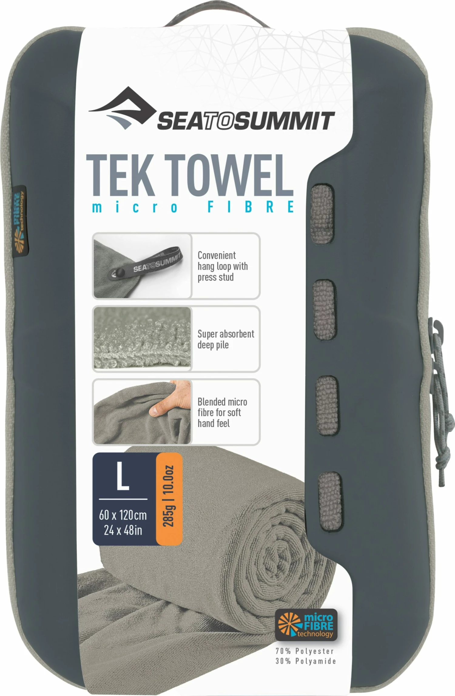 Sea to Summit Tek Towel™ L – 60 x 120 cm er nemlig fremstillet af en superlet, ekstrem blød og slidstærk mikrofiber, bestående af 80% genindvundet polyester og 20% nylon, som vævet med den særlige frottéstruktur giver øget overfladeareal og derfor en enestående vandabsorption. Håndklædet er forsynet med ophængningsstrop med knaplukning, så du altid kan hænge håndklædet fra dig.
