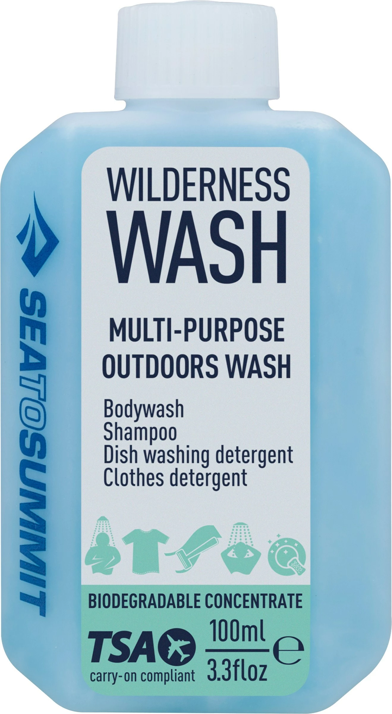 Wilderness Wash, 100 ml er sæben, der klarer det hele! Både den personlige hygiejne, hvor den er skånsom mod huden, men også til tøjvask eller den almindelige opvask, hvor den er yderst effektiv.