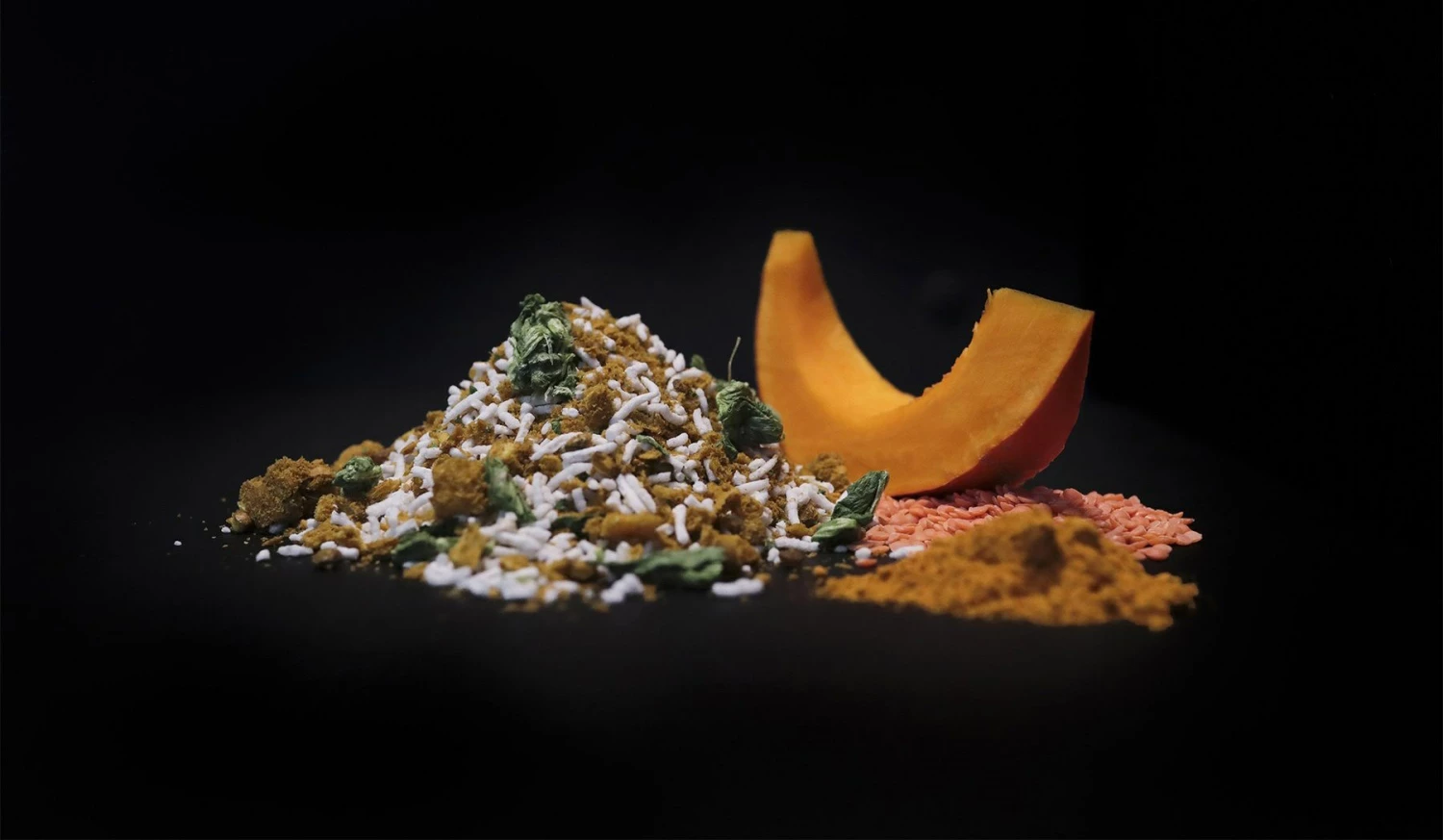 Ingredienser: Til 100 g tørvare er anvendt 49 g linser* (røde, grønne), 28 g ris*, 26 g butternut squash*, løg*, rapsolie*, kokosekstrakt*, 17 g spinat*, salt, æbleeddike*, ingefærjuice*, karry* (indeholder sennep), hvidløg*, gulerod*, porre*, blomkål*, persille*, broccoli*, fennikel*, savojkål*, selleri*, sukker*, gurkemeje*, chili*, krydderier*.