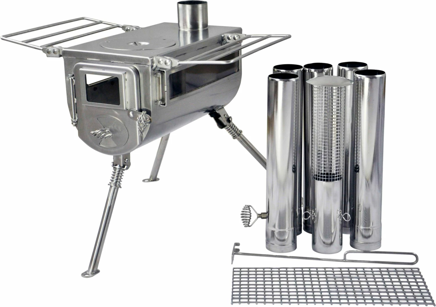 Winnerwell Woodlander Double View Medium Cook Camping Stove leveres med fire skorstensstykker på hver 36,5 cm (diameter på 2,5″), et rørstykke på samme længde med indbygget luftregulator, en gnistfanger til toppen af skorstenen, en askeskraber og en rist til bunden af ovnen.